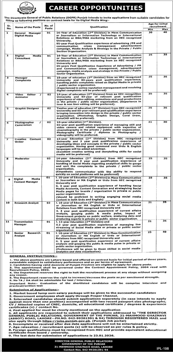 Directorate General of Public Relations DGPR Punjab Jobs January 2026