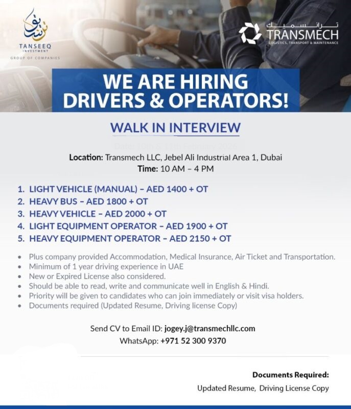 Transmech, which stands as a prominent logistics and transport company, will conduct a Walk in Interview in Dubai to recruit experienced drivers and equipment operators. The recruitment drive provides an excellent chance for candidates who want to secure permanent employment in the UAE which comes with appealing advantages.
